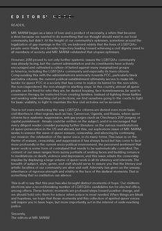 Layout design and first cover for Atlanta’s premier collegiate queer literary magazine, MR. MA'AM. (Second edition cover designed by Josh Oberlander.)